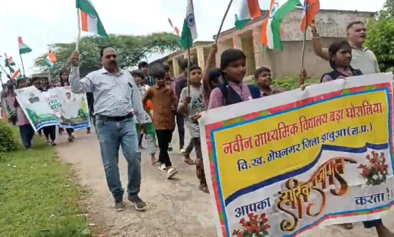 कार्यक्रम की शुरुआत राष्ट्रगान के साथ हुई उसके बाद हाथों में तिरंगा लिए स्कूली छात्र-छात्राएं व ग्रामीण भारत माता की जय के नारे लगाते हुए रैली के रूप में निकले इस अवसर पर मेघनगर मण्डल अध्यक्ष रूपसिंह भूरिया ने कहा कि राष्ट्रीय ध्वज को घर-घर पहुंचाने का एक राष्ट्रव्यापी आंदोलन है राष्ट्रीय ध्वज हमारी साझा पहचान है स्वतंत्रता और एकता का एक भव्य उत्सव है जो तिरंगे की भावना से ओत प्रोत हैं यह केवल एक प्रतीक नहीं बल्कि हमारे राष्ट्र के सामूहिक गौरव और आकांक्षाओं का जीवंत प्रतिनिधित्व है इस अवसर पर विद्यालय परिवार द्वारा अतिथियों का पुष्पमाला से स्वागत किया गया आयोजन में मुख्य रूप से शिक्षिका संगीता मखोडीया , अनसीना भूरिया ,किरण निनामा ,पार्वती , बीएलओ नितेश शर्मा , शिक्षक दीपक मचार , आदि उपस्थित थे
